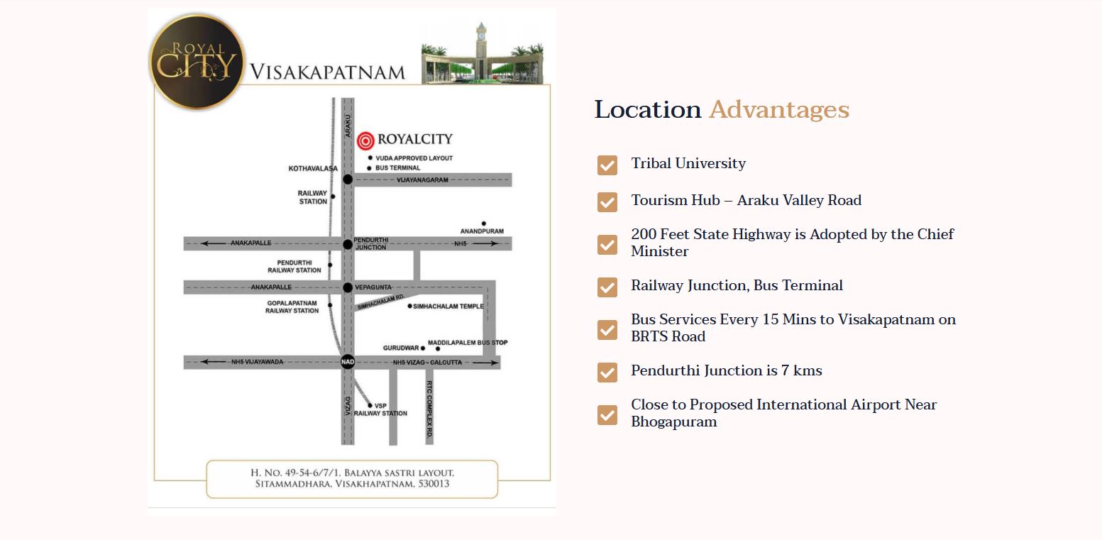 Royal City Integrated Township at Kothavalasa, visakhapatnam : This site is very accesible with a railway station and bus terminal being at this junction and also the Visakhapatnam railway station being a little farther away from this junction. It is also close to the porposed International airport near Bhogapuram, with it’s entry being right on the 200 ft state highway leading to Araku, one of the most sought after hill stations in South India.